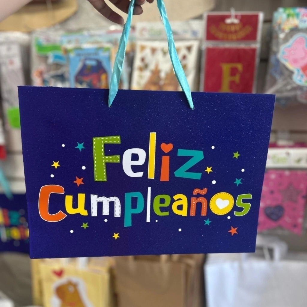 Bolsa de cartón “Feliz Cumpleaños” con glitter, ideal para entregar regalos o sorpresitas con una presentación que llama la atención desde el primer momento. ¡Colorida, resistente y con manijas de cinta que le dan toda la facha! ✨