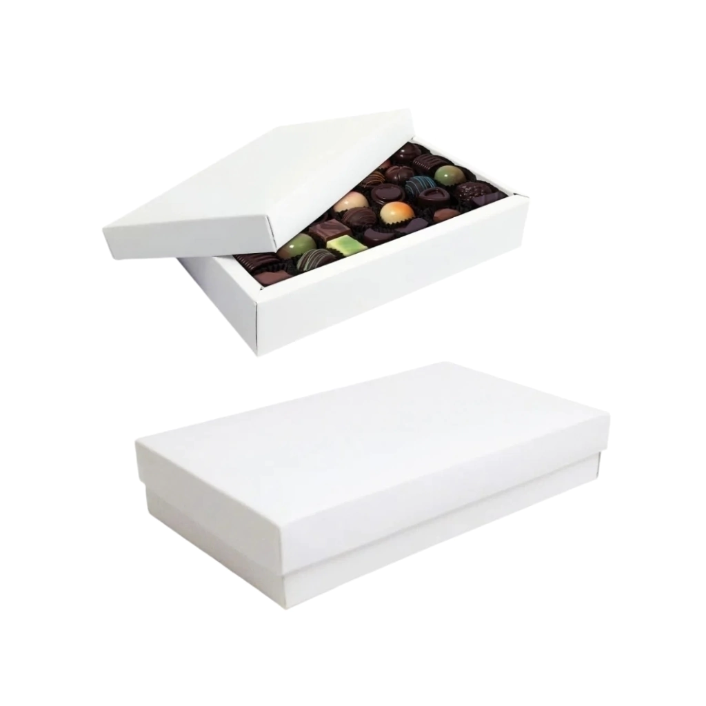 Cajitas bomboneras de cartón, con base blanca y tapa blanca, tamaño 1/2 Kg, ideales para bombones, trufas, chocolates, combos dulces o regalos empresariales. Prácticas, resistentes y con un diseño que queda bien en cualquier ocasión.