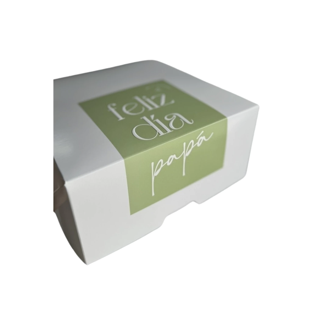 Caja Box “Feliz Día Papá” en cartulina rígida de excelente calidad, con letras en relieve que le dan ese toque premium que tu sorpresa merece 💚