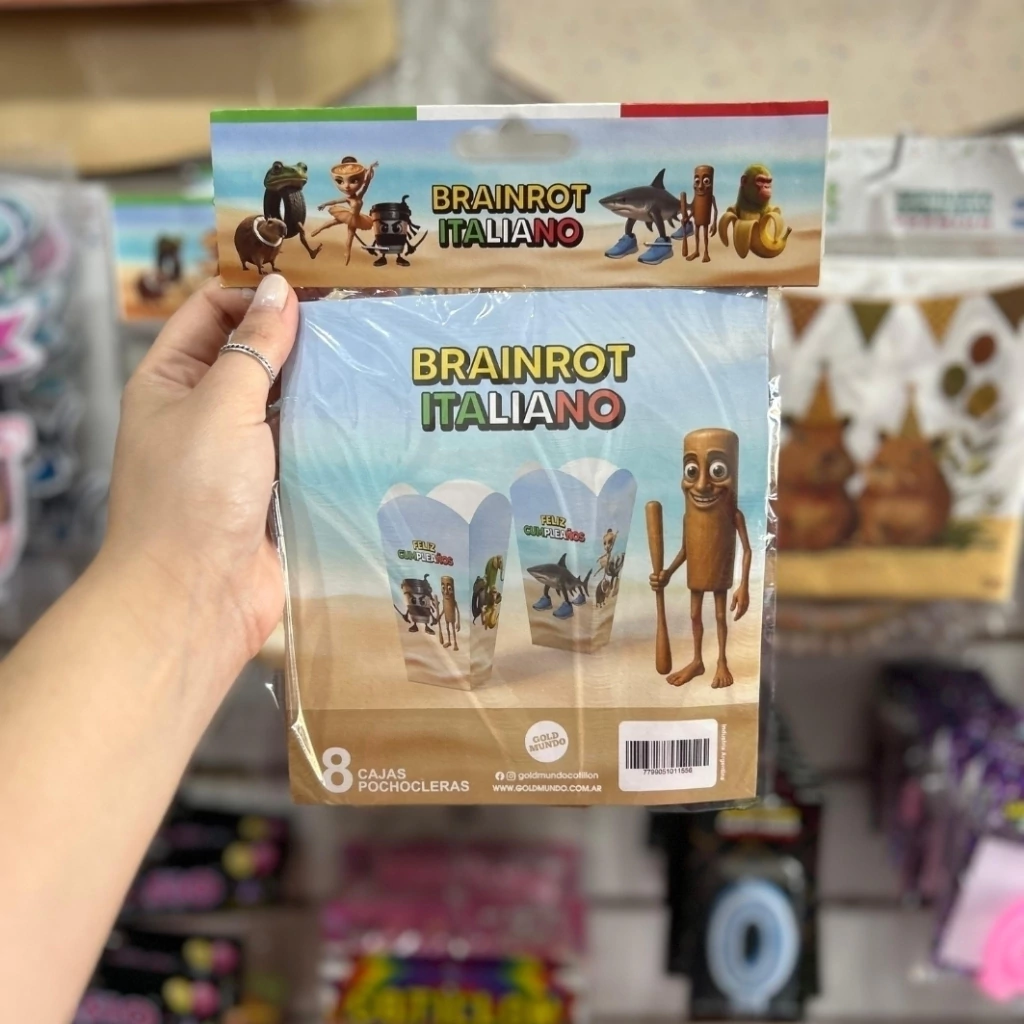 Pack de 8 cajas de pochoclo Tralalero Tralalá, con diseño a full color y personajes virales para completar la deco más random y divertida de la fiesta. ¡No hay cumple completo sin snacks con estilo! 😎