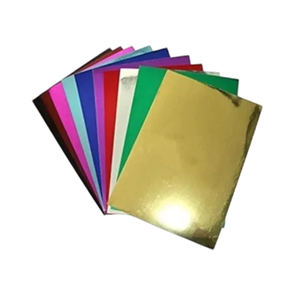Cartulinas metalizadas en colores surtidos, tamaño 45 x 63 cm, fabricadas en papel de 120 gramos, con acabado brillante tipo espejo.