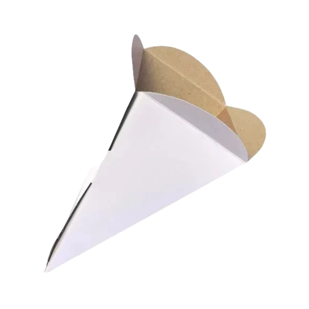 Conos armables de cartulina blanca satinada, medida 20 cm de largo, perfectos para servir pochoclo, papas fritas, golosinas, snacks o confites en eventos formales, candy bars, fiestas temáticas o servicios gourmet.
