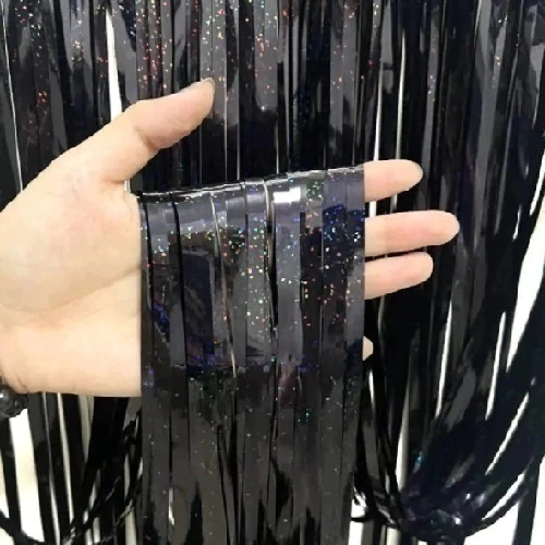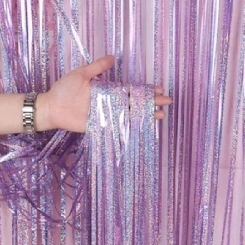 Cortina metalizada holográfica, con destellos multicolor que cambian según la luz.
