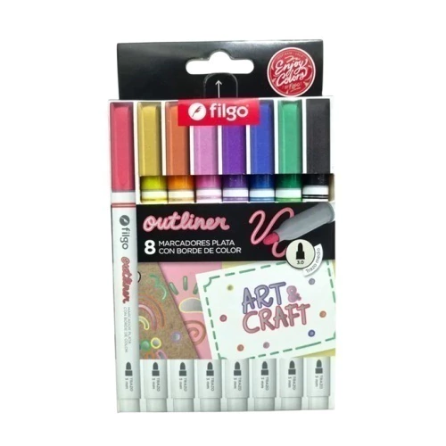 Set de marcadores FILGO Outliner x8 unidades, con tinta plata metalizada y borde de color automático. Al escribir, el trazo genera un efecto doble: centro plateado y contorno vibrante. ¡Perfectos para lettering, tarjetas, invitaciones, scrapbooking y más!