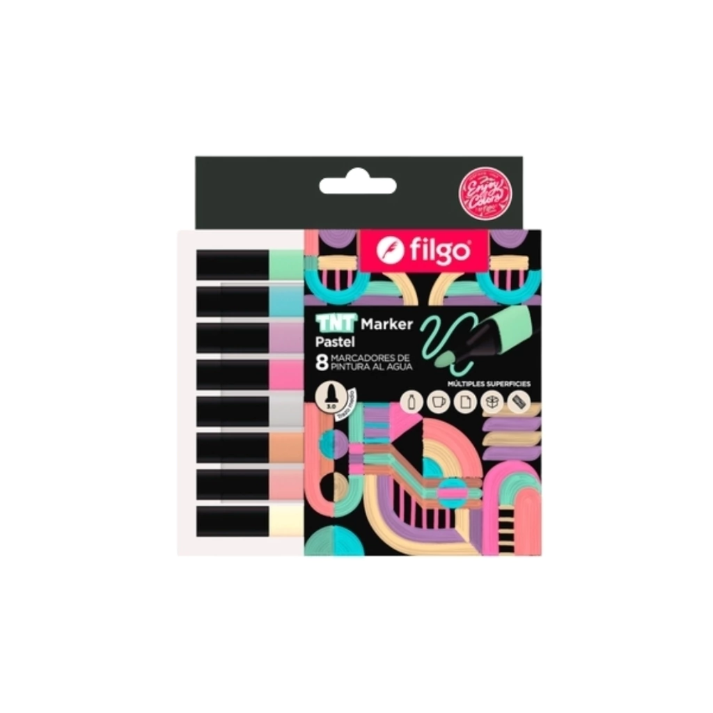 Set de 8 marcadores FILGO TNT tonalidad pastel, con tinta al agua y punta redonda. Perfectos para lettering, decoración, cartelería y manualidades sobre múltiples superficies. Tinta opaca y resistente.