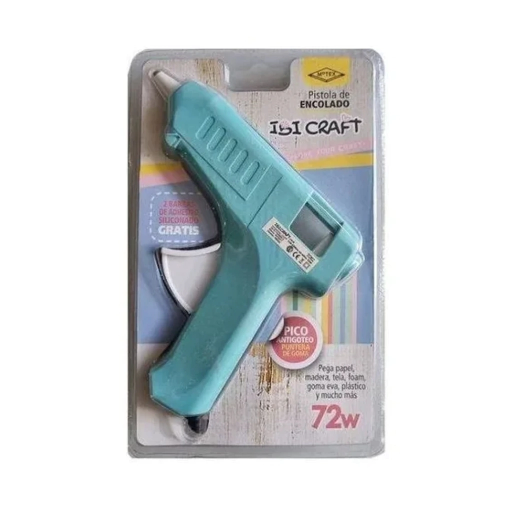 Pistola encoladora Ibicraft de 72W, rápida, potente y con diseño en colores pastel que la hace tan linda como funcional. Ideal para pegar cartón, madera, goma eva, tela, plástico y más. ¡Un infaltable para manualidades, deco, arreglos o emprendimientos creativos!