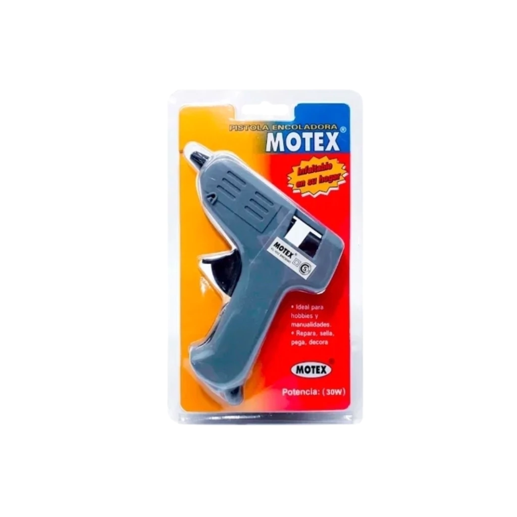 Pistola encoladora MOTEX de 30W, ideal para trabajos de manualidades, hobbies, arreglos en el hogar y proyectos DIY. Rápida, práctica y fácil de usar con barras de silicona estándar.