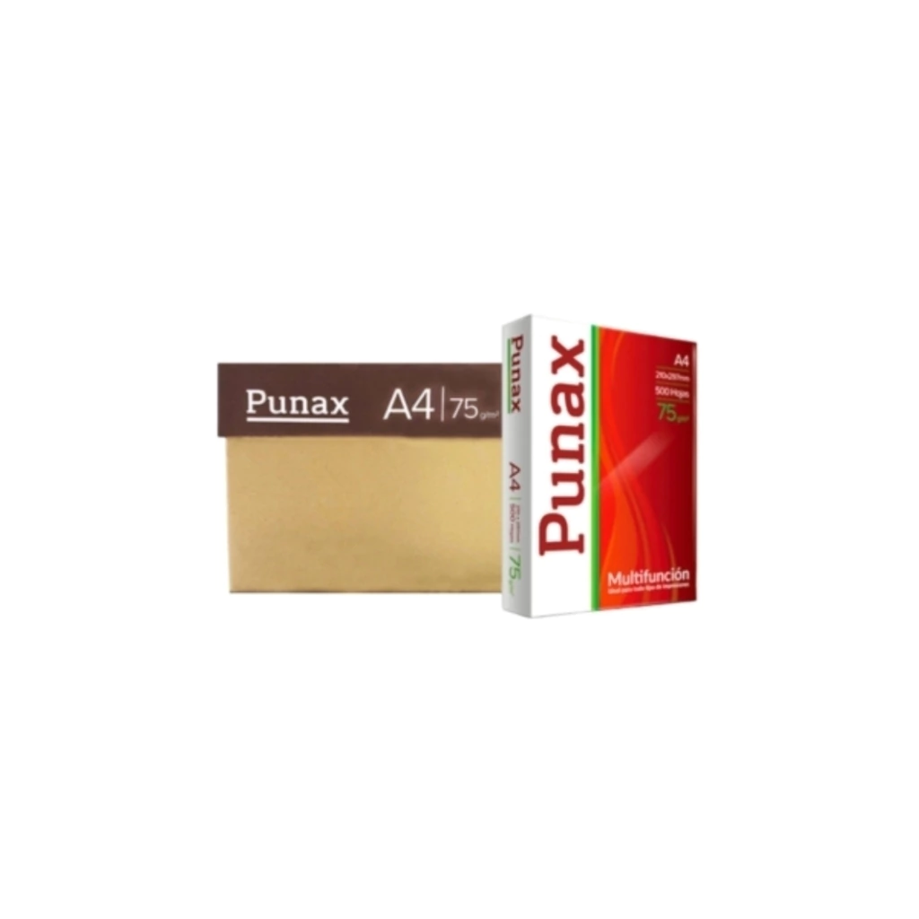 Caja cerrada con 10 resmas de hojas A4 PUNAX, cada una con 500 hojas de 75 g/m². Calidad y rendimiento asegurado para trabajos de impresión, copiado o uso escolar/profesional. 🖨️✏️