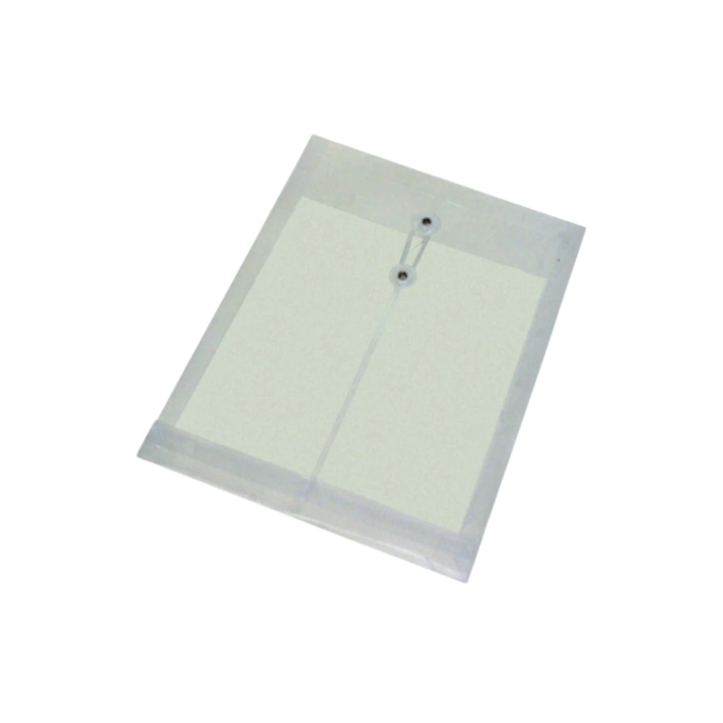 Sobre vertical de PVC con cierre a hilo, súper práctico para guardar documentos, hojas sueltas, recibos o papeles importantes.