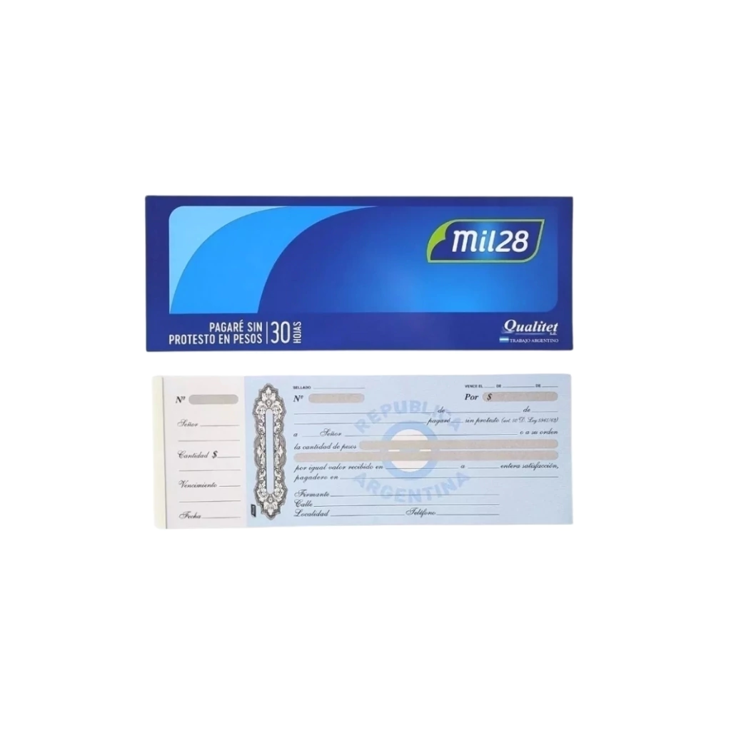 Talonario de pagarés sin protesto en pesos, marca Mil28, formato legalmente aprobado para uso comercial o personal.