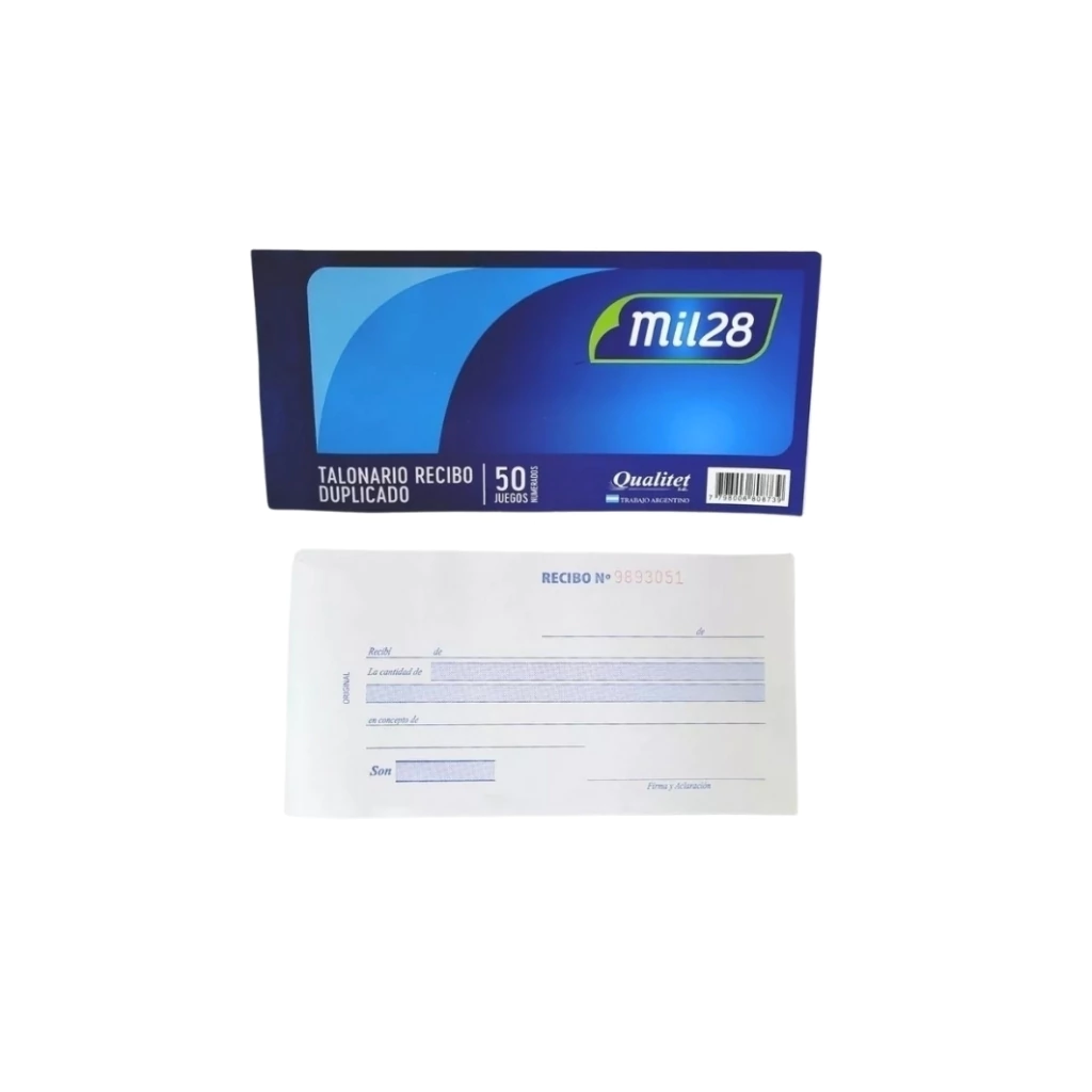 Talonario de recibos duplicado marca Mil28, ideal para uso comercial, profesional o personal.