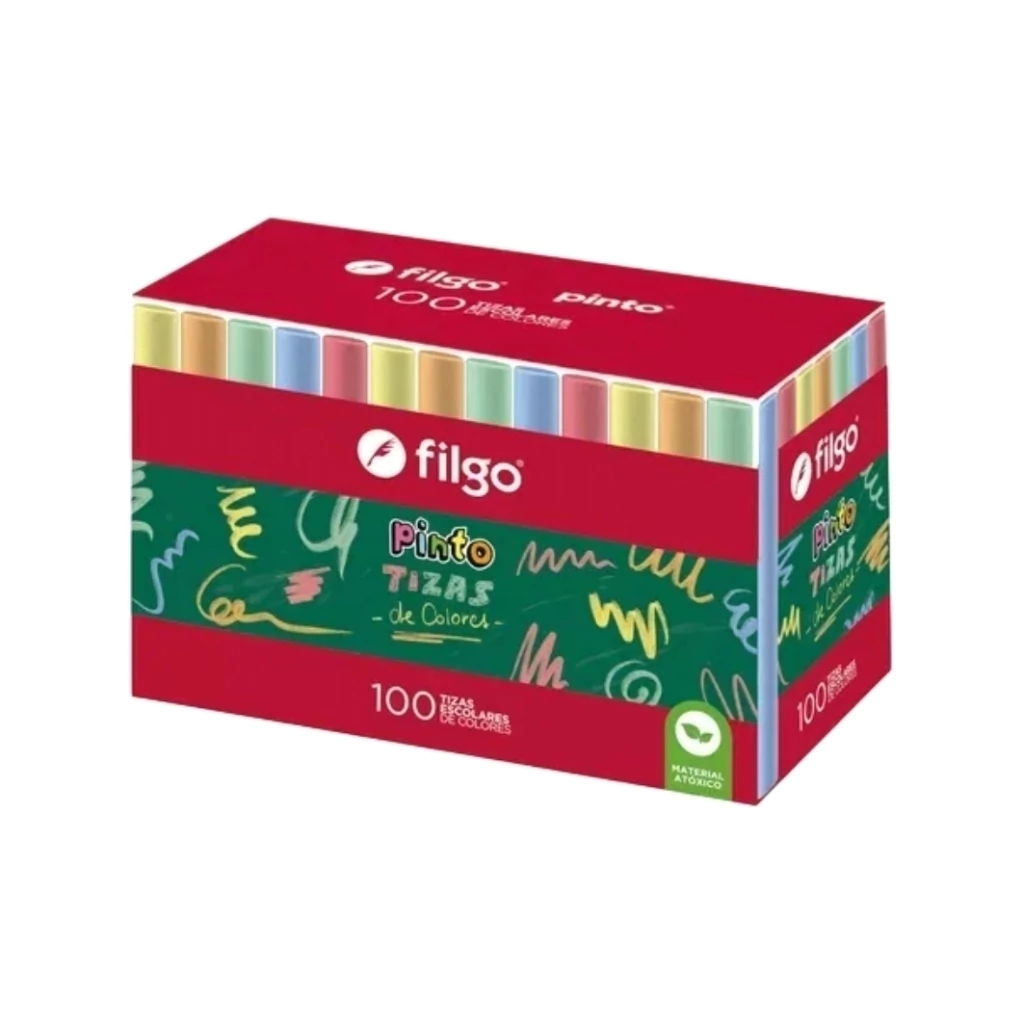 Caja de 100 tizas FILGO en colores surtidos, perfectas para escuelas, talleres artísticos, ferias y docentes.